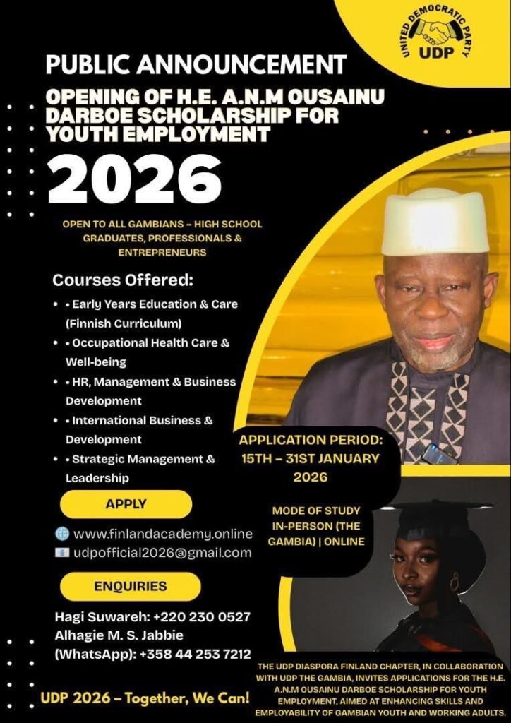 The United Democratic Party (UDP) has launched the H.E. A.N.M Ousainu Darboe Scholarship for Youth Employment, aimed at enhancing skills development and professional opportunities for Gambians at home and abroad.